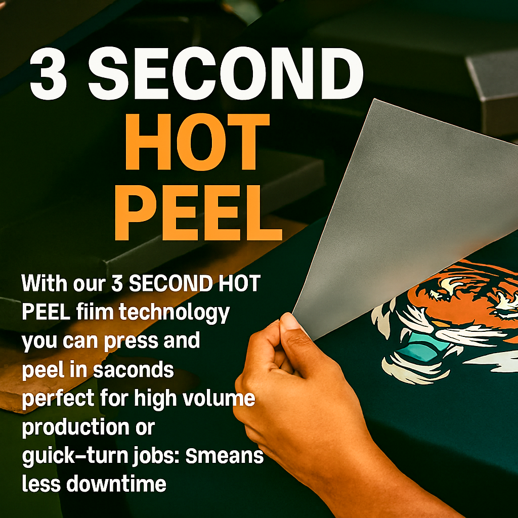 With our 3 SECOND HOT PEEL film technology, you can press and peel in seconds—perfect for high-volume production or quick-turn jobs. Smooth release means less downtime and more efficiency.